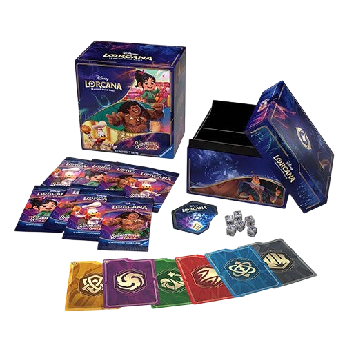 The ultimate treasure for both collectors and players, the Illumineer’s Trove contains a full-art storage box with six ink-themed card dividers to keep your Disney Lorcana TCG cards safe and organized by ink.